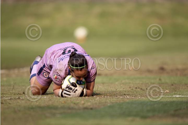CIUDAD DE MÉXICO, 21ENERO2024. La portera Blanca Félix se queda con el balón a la llegada de Aerial Chavarin de la Maquina durante el partido de fútbol Cruz Azul vs Guadalajara correspondiente a la jornada 4 del Torneo Clausura 2025 de Liga BBVA MX Femenil, en instalaciones de La Noria. FOTO: EDGAR NEGRETE LIRA/CUARTOSCURO.COM