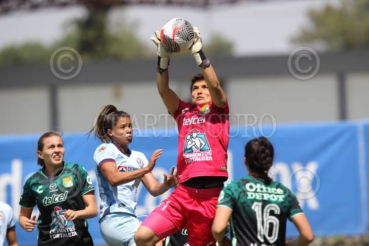 CIUDAD DE MÉXICO, 30SEPTIEMBRE2023. María Martínez portera del León ataja un balón durante el partido de fútbol Cruz Azul vs León correspondiente a la jornada 12 del Torneo Apertura 2023 de Liga BBVA MX Femenil, en instalaciones de La Noria. FOTO: EDGAR NEGRETE/CUARTOSCURO.COM