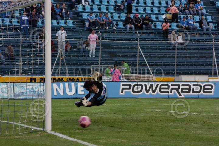 MEXICO,DF,04.MAYO,2008.- Miguel Calero, portero del Pachucha, se vio obligado a lanzarse para evitar que el balón, que le regreso un compañero, entrara a su porteria durante los primeros minutos del partido con los Pumas de la UNAM, que termino empatado cero a cero. FOTO: PEDRO VALTIERRA/CUARTOSCURO.COM