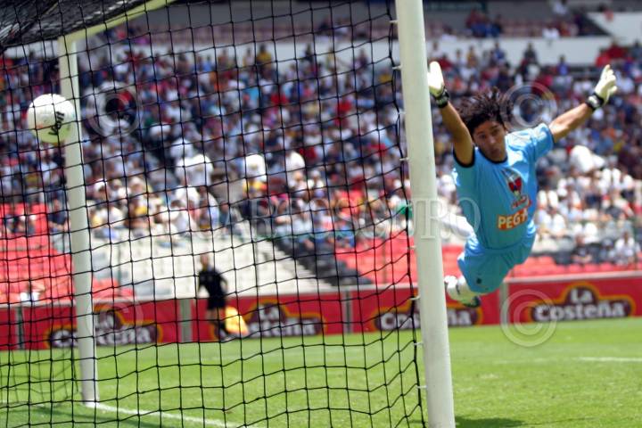 México, D.F. 22 AGOSTO 2004.- Rafael Cuevas, portero del Atlante intentó detener el disparo a gol de los Pumas de la Universidad, durante el encuentro sostenido en el Estadio Azteca. FOTO: Sandra Perdomo/CUARTOSCURO.COM