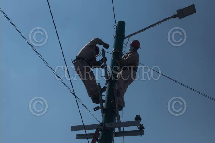 Trabajadores de la Comisión Federal de Electricidad (CFE) arreglan el servicio de luz en uno de los postes de Avenida Ermita Iztapalapa