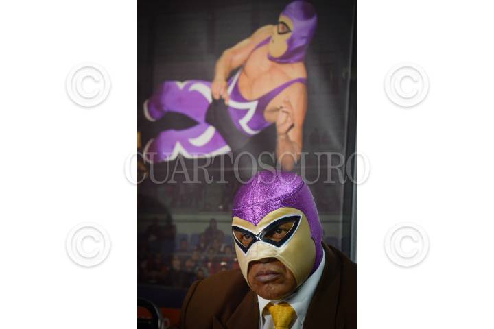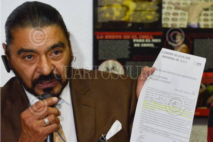 José Antonio Becerril "El Fantasma", comisionado de Lucha Libre Profesional de la capital, durante conferencia de prensa en la que se anunció la suspensión indefinida del luchador Einar "El Vikingo".