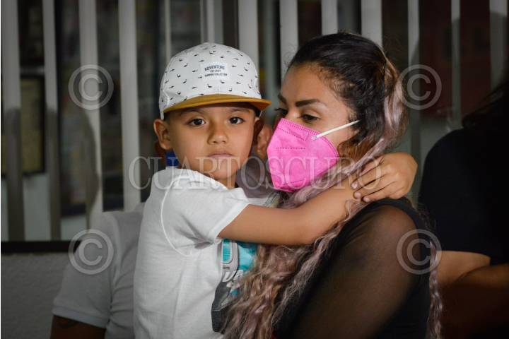 Matías, niño agredido por el luchador "El Vikingo" en compañía de su mamá salió al final de la conferencia en la que se anunció la suspensión indefinida de Einar "El Vikingo" por parte de la Comisión de Lucha Libre Profesional de la capital.