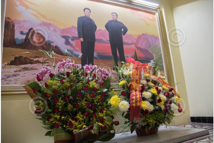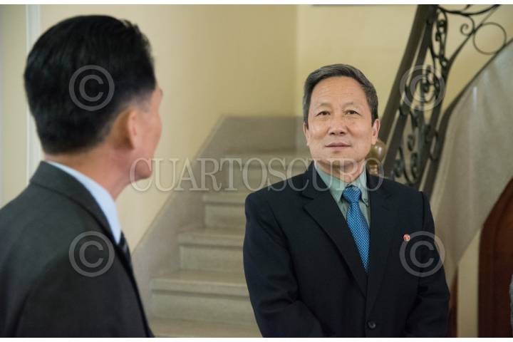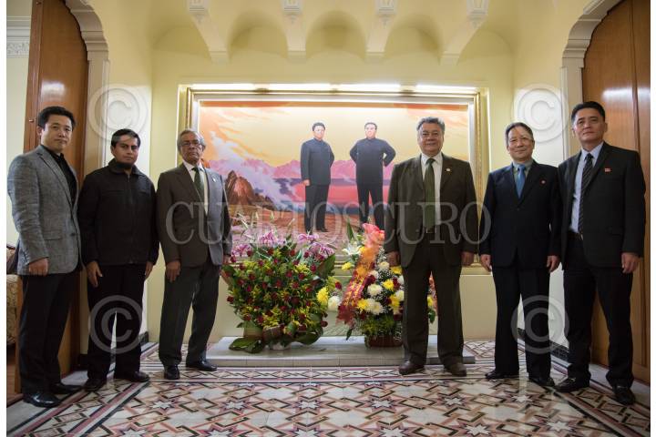 CIUDAD DE MÉXICO, 08JULIO2017.- En la embajada de Corea del Norte, Jesús Antonio Carlos Hernández, secretario General del Partido Popular Socialista (PPS) y Luis Guzmán Rivera, secretario de Relaciones PPS, entregaron una ofrenda para los líderes de Corea del Norte: Kim Il-sung y Kim Jong-il, en presencia de Kim Hyong Gil, embajador de Corea del Norte en México, y el consejero de prensa Ryu Su Nam. FOTO: MARIO JASSO /CUARTOSCURO.COM