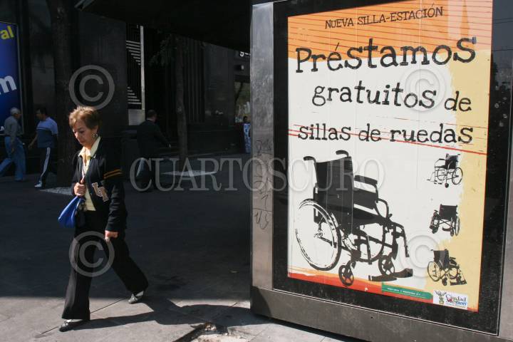 MÉXICO, D.F., 16NOVIEMBRE2010.- Una "silla-estación" donde se prestan de manera gratuita sillas de ruedas fue instalada en la esquina de Juárez y Eje Central. FOTO: ISAAC ESQUIVEL/CUARTOSCURO.COM
