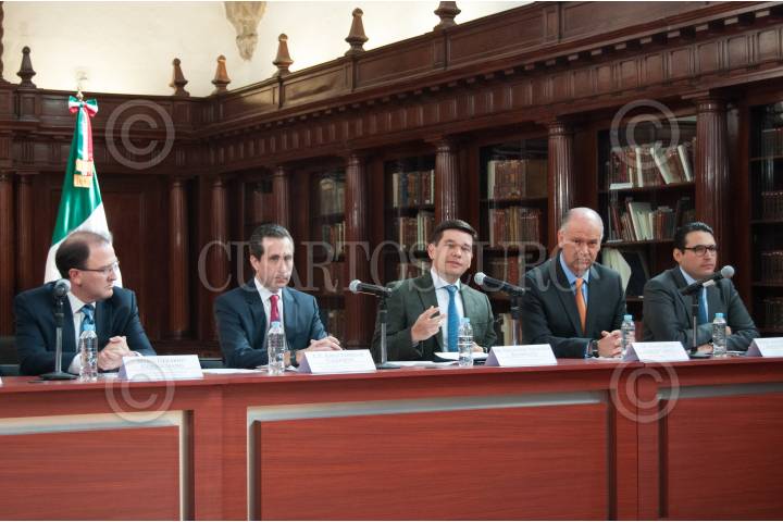 CIUDAD DE MÉXICO, 05FEBRERO2016.- Gerardo Corrochano, Director del Banco Mundial para Colombia y México; Jorge Familiar Calderón, Vicepresidente del Banco Mundial para América Latina y el Caribe; Fernando Aportela Rodríguez, subsecretario de Hacienda y Crédito Público; Juan Carlos Cortés García, Director General de la FND y José Bernardo González Rosas, titular de la unidad de banca de desarrollo, durante la firma del préstamo del Banco Mundial a la Financiera Nacional de Desarrollo Agropecuario, Rural, Forestal y Pesquero (FND), para la expansión de las finanzas rurales. FOTO: DIEGO SIMÓN SÁNCHEZ /CUARTOSCURO.COM