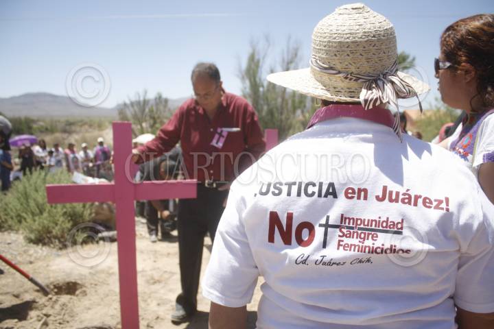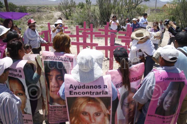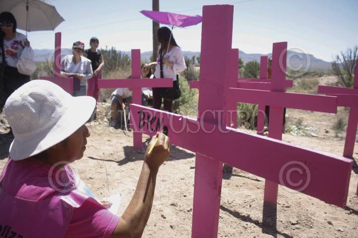 CIUDAD JUÁREZ, CHIHUAHUA, 09MAYO2014.- Madres de mujeres desaparecidas marcharon desde Ciudad Juárez hasta la entrada del arroyo del Navajo en donde colocaron varias cruces entre Independencia y Juárez Porvenir. El acto fue para recordar a las jóvenes que localizaron sin vida en el arroyo en 2012. Posteriormente arribaron a Praxedis en donde tiene ubicación el arroyo y sentenciaron al gobierno municipal, estatal y federal por los actos que realizan al no localizar con vida a las mujeres FOTO: NACHO RUIZ /CUARTOSCURO.COM