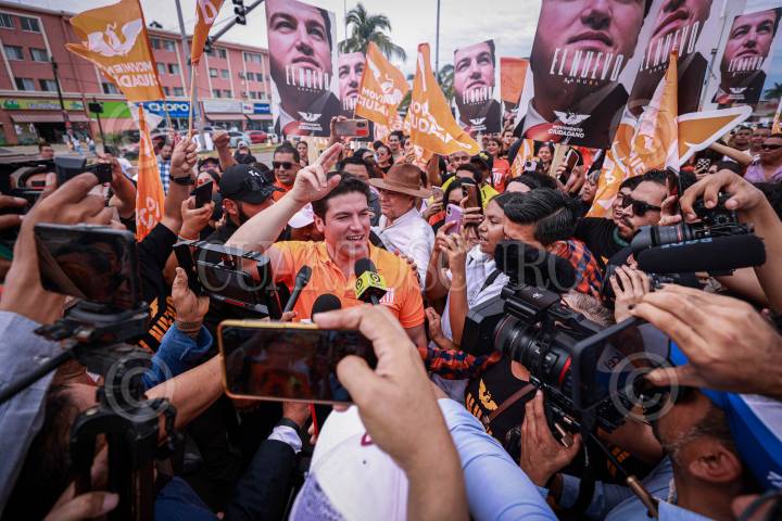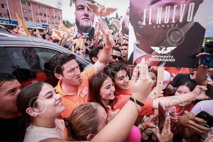COLIMA, COLIMA, 27NOVIEMBRE2023.- Samuel Alejandro García Sepúlveda Precandidato de Movimiento Ciudadano a la Presidencia de la República, llegó a Manzanillo, Colima, donde los ciudadanos le mostraron su respaldo de cara a las elecciones del próximo 2 de junio. Tras reunirse con empresarios y militantes de MC en esta ciudad, el abanderado naranja se dirigió al Bulevar Miguel de la Madrid para colocar la 'Calca matona' a los automovilistas. Al llegar decenas de seguidores se tomaron la foto del recuerdo con Samuel, ante la mirada de los conductores que circulaban por el lugar, tocando el claxon de su automóvil en señal de apoyo. FOTO: PRENSA SAMUEL GARCÍA/CUARTOSCURO.COM