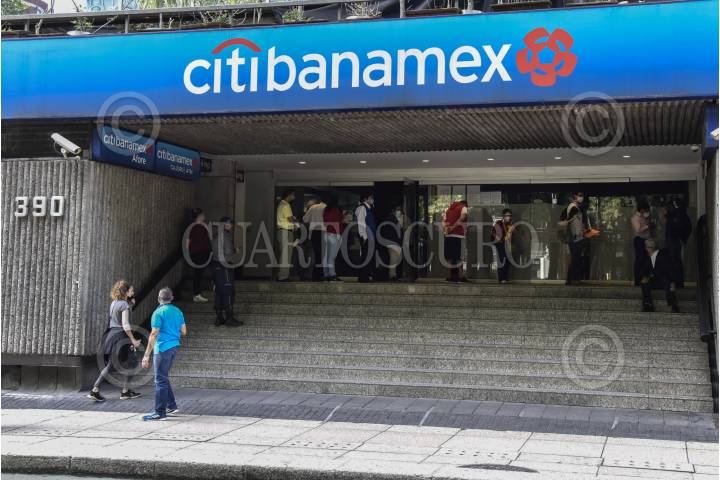 Persona esperan en una fila de una sucursal bancaria.