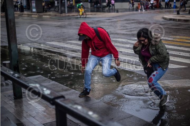 CIUDAD DE MÉXICO, 05AGOSTO2018.- Dos jóvenes saltán un charco de agua en calles del centro de la ciudad, durante la precipitación pluvial que cayó la tarde de hoy en la ciudad de México. FOTO: MISAEL VALTIERRA / CUARTOSCURO.COM