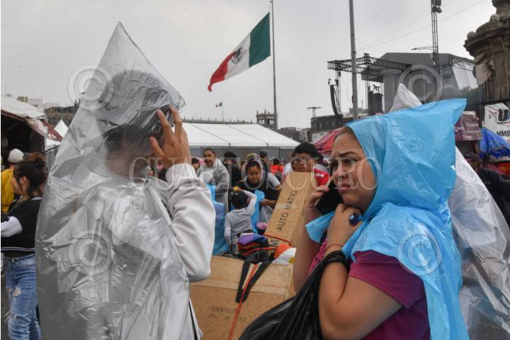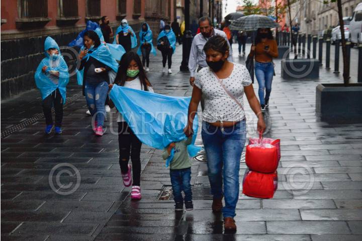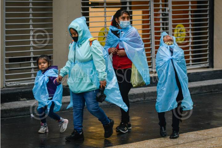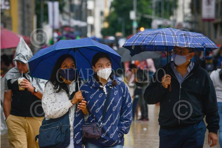 Transeúntes se desplazan sobre las calles del centro histórico mientras ligeras precipitaciones se registran en la capital.