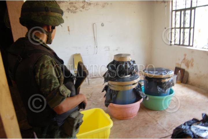 EL VAQUERITO MPO. CHARRO, MICHOACAN 26JULIO.- Fue desmantelado un "narcolaboratorio" que servía para fabricar droga sintetica conocida como "Crystal", en el lugar se encontraron diversos precursores químicos, como sosa caustica, thiner y diferentes sustancias desconodidas en la comunidad de El Vaquerito perteneciente al municipio de Charo Michoacán. FOTO: CUARTOSCURO.COM