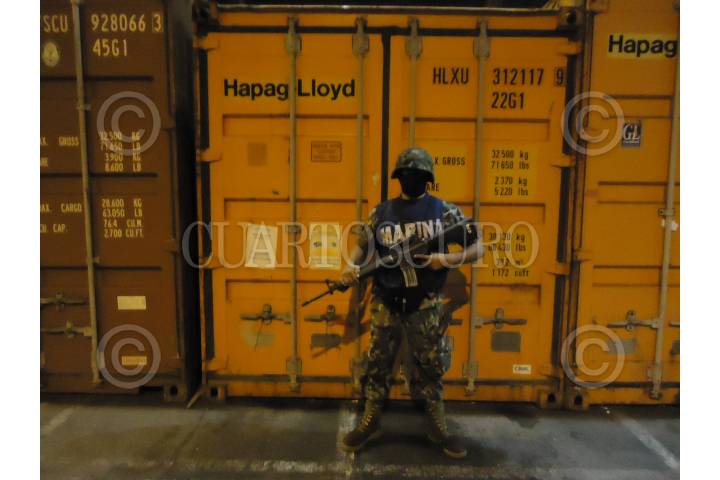 LÁZARO CÁRDENAS, MICHOACÁN, 28AGOSTO2011.- En un operativo conjunto, los agentes aduaneros, de la fiscalía federal y marinos de la Armada de México inmovilizaron un contenedor embarcado en Jawaharlal Nehru, India, con destino al puerto de Lázaro Cárdenas en el Pacífico mexicano, indicó un comunicado conjunto de la Secretaría de Marina y de la Procuraduría General de la República (PGR). Las dependencias indicaron que el contenedor, que había sido transportado en el buque "Japan" de bandera de Hong Kong, contenía una bolsa flexible con un peso total de 17 mil 900 kilogramos de una sustancia denominada "2 fenilacetato de etilo", un precursor químico que puede ser utilizado en la elaboración de droga sintética. FOTO: CUARTOSCURO.COM