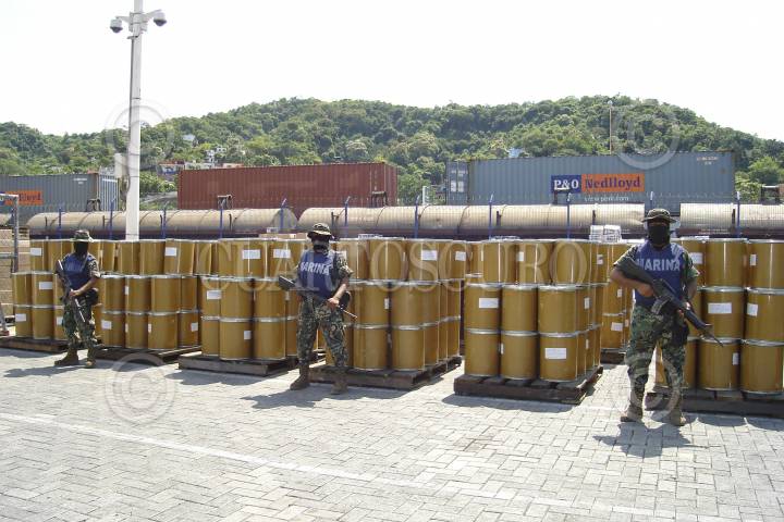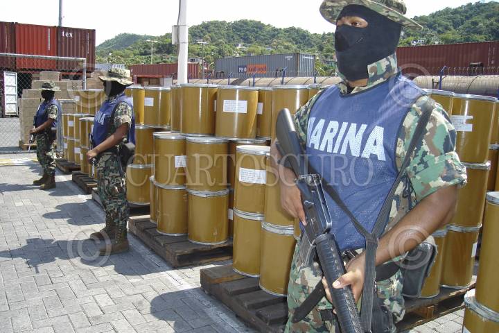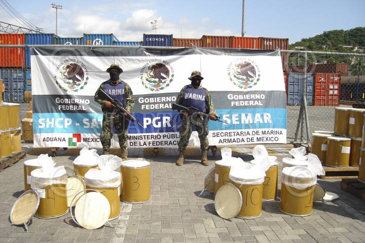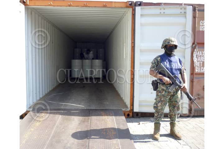 MANZANILLO, COLIMA, 10ENERO2012.- La Secretaría de Marina y la Procuraduría General de la República (PGR) aseguraron contenedores provenientes de China, los cuales contenían un total de 32 mil 670 kg. de metilamina, precursor químico utilizado en la elaboración de drogas sintéticas. FOTO: SEMAR/CUARTOSCURO.COM