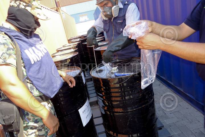 MÉXICO, D.F., 19DICIEMBRE2011.- La Secretaría de Marina-Armada de México (Semar) y el Servicio de Administración Tributaria (SAT), logró inmovilizar, en el Puerto de Lázaro Cárdenas, Michoacán, 480 tambos con más de 99 mil 700 kilogramos de una sustancia denominada Monometilamina, precursor químico que puede ser utilizado en la elaboración de droga sintética. FOTO: SEMAR/CUARTOSCURO.COM