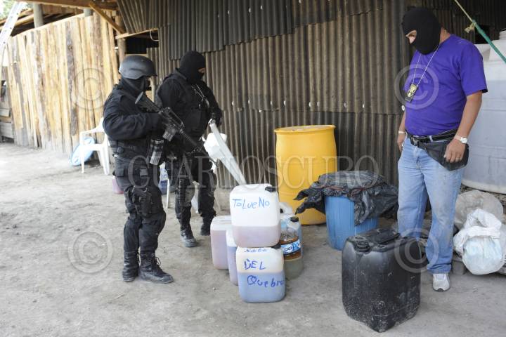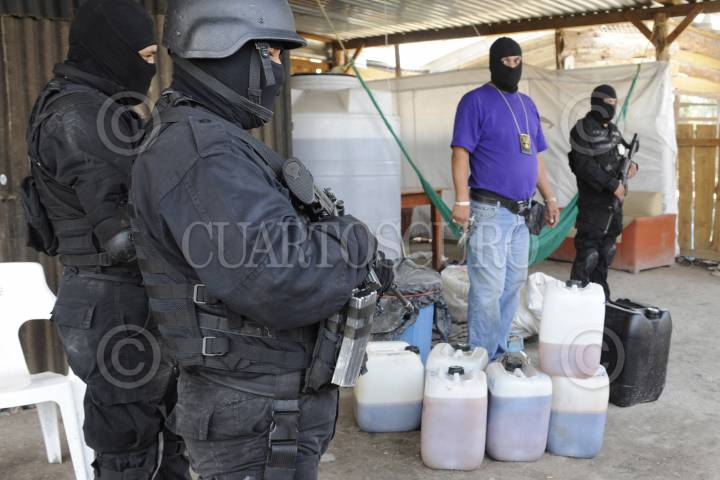 CHALCO, ESTADO DE MÉXICO, 18ABRIL2012.-Elementos de Inteligencia de la Secretaria de Seguridad Ciudadana en coordinación con elementos de la Policía Ministerial del Estado de México, realizaron un operativo en perímetro de Chalco y Tlahuac en donde aseguraron dos narco laboratorios con miles de kilos y litros de químicos para realizar drogas Crack y cocaína así como droga terminada lista para su consumo. FOTO: LUIS CARBAYO /CUARTOSCURO.COM