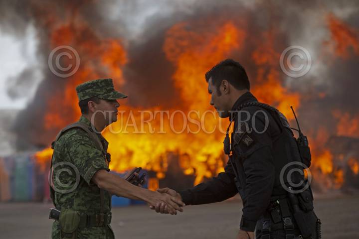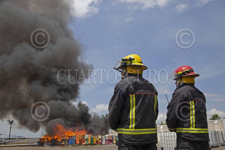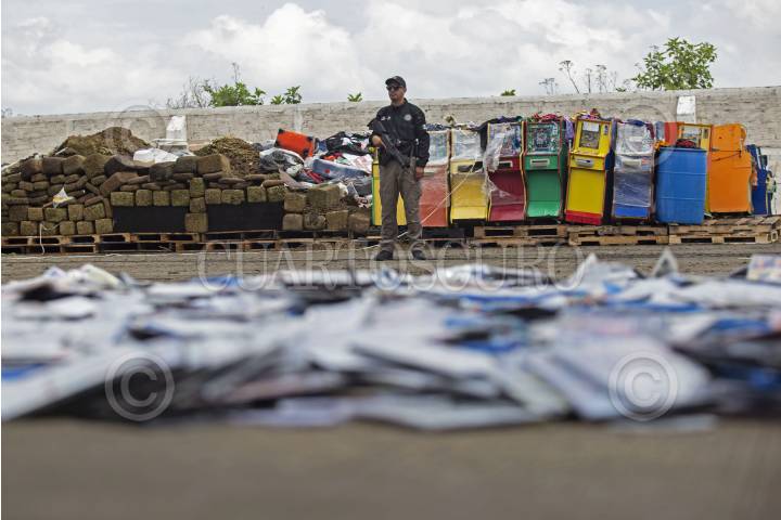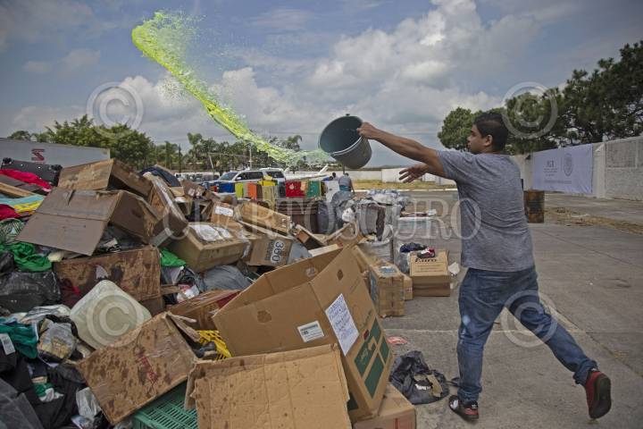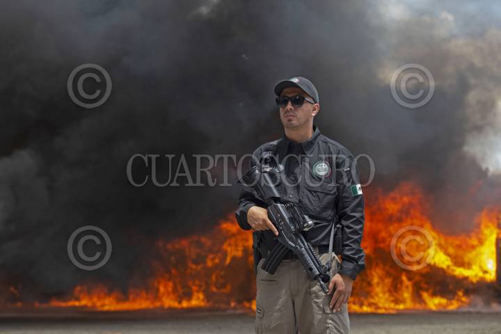 GUADALAJARA, JALISCO, 31AGOSTO2018.- Hoy en el area de usos multiples de la PGR ubicada en la Mojonera, se llevo a cabo la Ceremonia de Destrucción de 3 toneladas 200 kilogramos de narcóticos en los que se encuentran Marihuana, Metanfetaminas, cocaína y 21 toneladas de precursores químicos para la elaboración de drogas sint´ticas así como 7 tonelada de productos apócrifos entre los que destacan 150 maquinas tragamonedas y 16 mil litros de bebidas alcohólicas. FOTO: FERNANDO CARRANZA GARCIA / CUARTOSCURO.COM