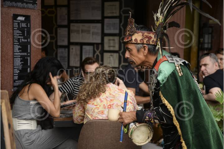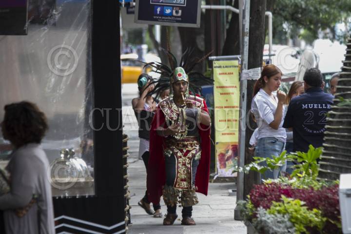 MÉXICO, D.F., 10MAYO2015.- Con un vestido típico de nuestros ancestros los Aztecas, un anciano baila y toca música prehispánica, solicitando a los comensales unas monedas. FOTO: ISABEL MATEOS /CUARTOSCURO.COM