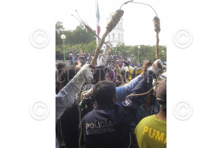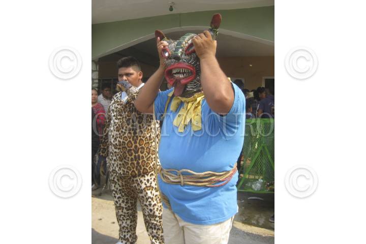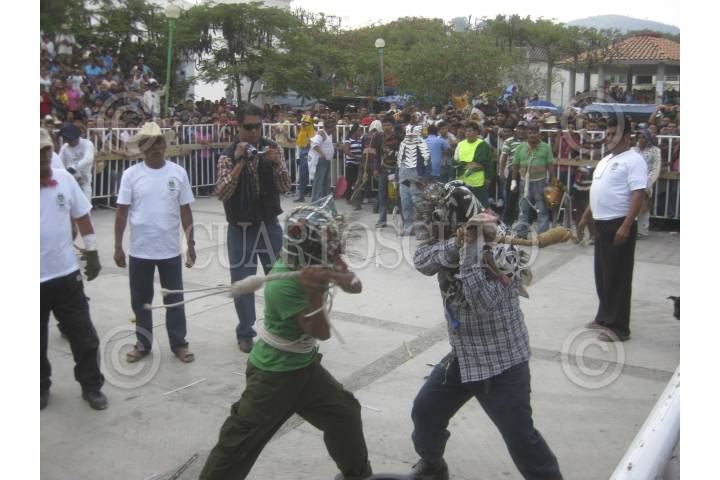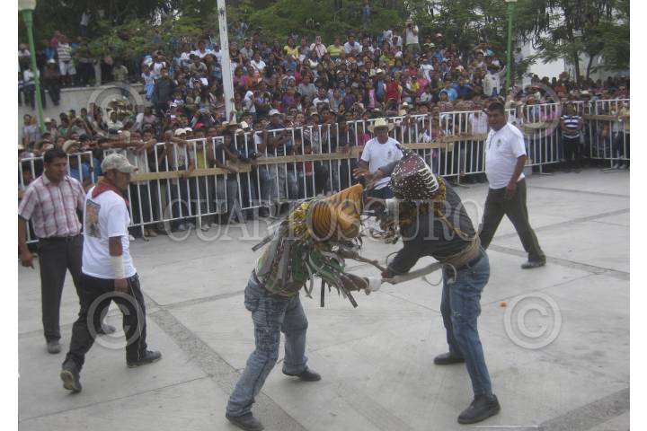 ZITLALA, GUERRERO, 05MAYO2012.- Como cada 5 de mayo, habitantes de este municipio, enclavado en la region de la montaña baja del estado, realizaron su tradicional petición de lluvias, donde hombres vestidos de tigres y con una riata amarrada al cuerpo se enfrascan en una pelea en la plaza central de la poblacion. Si la sangre corre, habra buen temporal y muchas veces los tigres que pelean en esta milenaria tradición son familiares o amigos pero ese vínculo nunca se rompera tras la pelea. Cabe mencionar que antes de iniciar con este ancestral ritual, los participantes son recibidos por los mayordomos en sus casas, donde les dan de comer y les reparten mezcal. Segun las creencias es para que aguanten el dolor de los golpes, haciendo posteriormente un recorrido por las principales calles de la poblacion hasta llegar a la plaza central, donde comienza el ritual. FOTO: OSVAR ALVARADO /CUARTOSCURO.COM