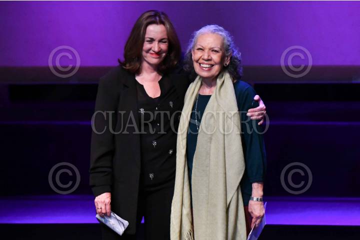 CIUDAD DE MÉXICO, 14SEPTIEMBRE2024.- Rosa Beltrán, titular de la Difusión de Cultura de la UNAM, y Luisa Huertas, actriz, durante la ceremonia de clausura y premiación del 31° Festival Internacional de Teatro Universitario (FITU) realizada en el Teatro Juan Ruiz de Alarcón del Centro Cultural Universitario (CCU) de la Universidad Nacional Autónoma de México (UNAM). FOTO: MARIO JASSO/CUARTOSCURO.COM