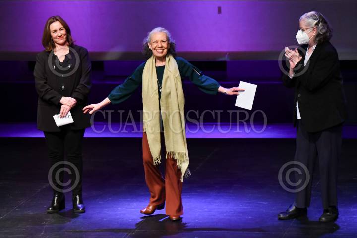 CIUDAD DE MÉXICO, 14SEPTIEMBRE2024.- Luisa Huertas, actriz, durante la ceremonia de clausura y premiación del 31° Festival Internacional de Teatro Universitario (FITU) realizada en el Teatro Juan Ruiz de Alarcón del Centro Cultural Universitario (CCU) de la Universidad Nacional Autónoma de México (UNAM). La acompañan: Rosa Beltrán, titular de Difusión de Cultura UNAM, y Patricia Argomedo, maestra en Antropología. FOTO: MARIO JASSO/CUARTOSCURO.COM