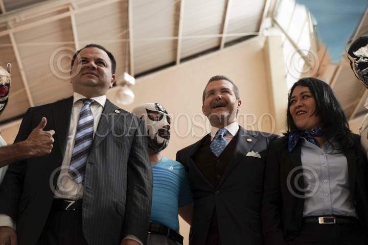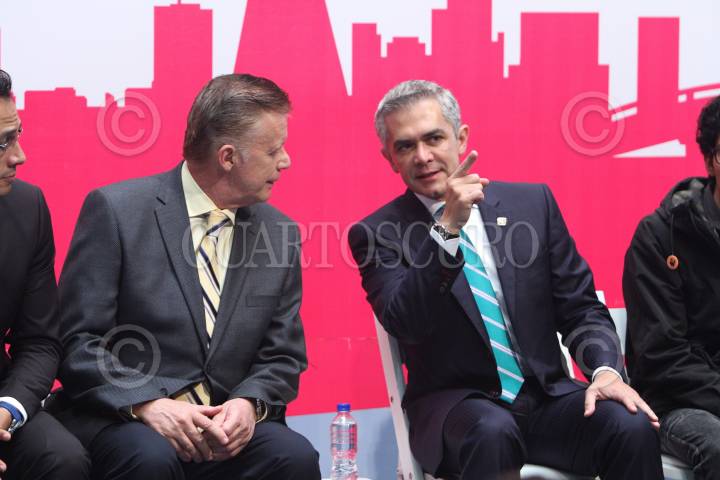 MÉXICO, D.F.,23MARZO2015.- Ramón Aguirre Díaz, director general de SACMEX y Miguel Ängel Macera, jefe de gobierno, durante la ceremonia de premiación de la segunda etapa del programa "HidroARTE". El programa hasta el momento consta de 134 murales ubicados en 34 sitios de impacto visual del Sistema de Aguas de la Ciudad de México. FOTO: ISABEL MATEOS /CUARTOSCURO.COM