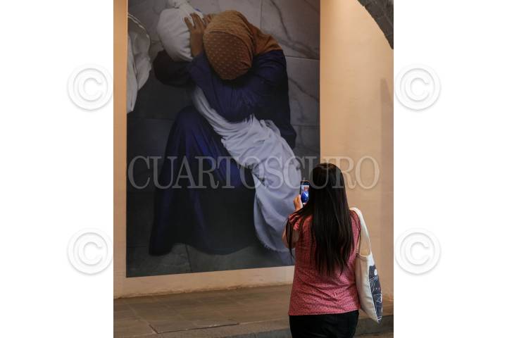 CIUDAD DE MÉXICO, 06JUNIO2024.- Una visitante del Museo Franz Mayer fotografia el retrato de Mohammed Salem, ganador del premio World Press Photo del año 2024, tomado el 17 de octubre 2023 en el hospital Nasser de Jan Yunis, en el sur de Gaza. FOTO:ALICE MORITZ/CUARTOSCURO.COM
