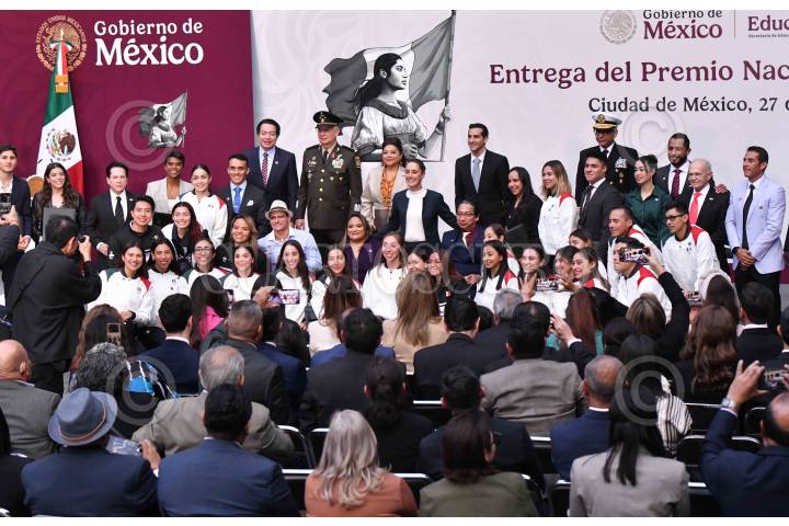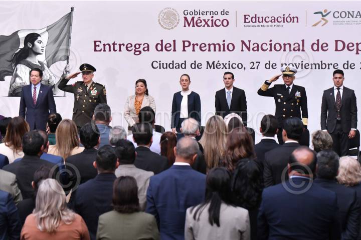 CIUDAD DE MÉXICO, 27NOVIEMBRE2024.- Claudia Sheinbaum, presidenta de México, encabezó la ceremonia de entrega del Premio Nacional de Deportes, realizada en Palacio Nacional. La acompañaron: Mario Delgado, secretario de Educación Pública; Ricardo Trevilla, secretario de la Defensa Nacional; Clara Brugada, jefa de Gobierno; Rommel Pacheco, titular de la CONADE; Raymundo Morales, secretario de Marina, y Osmar Olvera, clavadista y medallista olímpico. FOTO: MARIO JASSO/CUARTOSCURO.COM