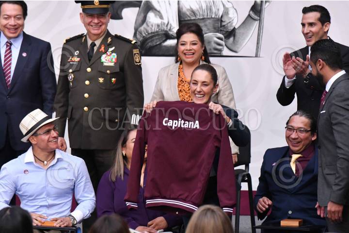 CIUDAD DE MÉXICO, 27NOVIEMBRE2024.- Claudia Sheinbaum, presidenta de México, recibió una chamarra con la palabra "CapitanA" durante la ceremonia de entrega del Premio Nacional de Deportes, realizada en Palacio Nacional. FOTO: MARIO JASSO/CUARTOSCURO.COM