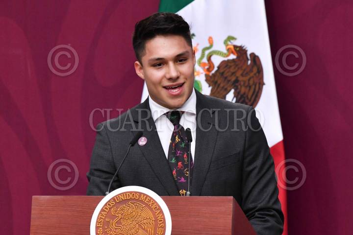 CIUDAD DE MÉXICO, 27NOVIEMBRE2024.- Osmar Olvera, clavadista olímpico, durante su discurso luego de recibir el Premio Nacional de Deportes por parte del gobierno federal, evento realizado en Palacio Nacional. FOTO: MARIO JASSO/CUARTOSCURO.COM