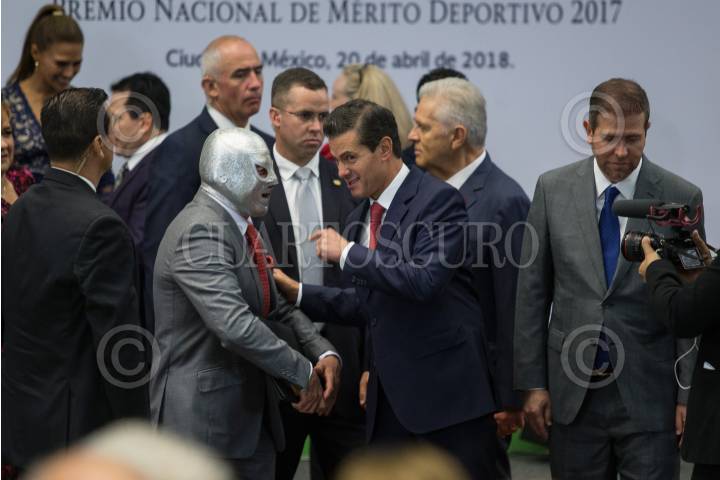 CIUDAD DE MÉXICO, 20ABRIL2018.- El Hijo del Santo y Enrique Peña Nieto, presidente de México, durante la ceremonia de entrega del Premio Nacional de Deportes y Premio Nacional de Mérito Deportivo 2017, realizado en la residencia oficial de Los Pinos. FOTO: ADOLFO VLADIMIR /CUARTOSCURO.COM