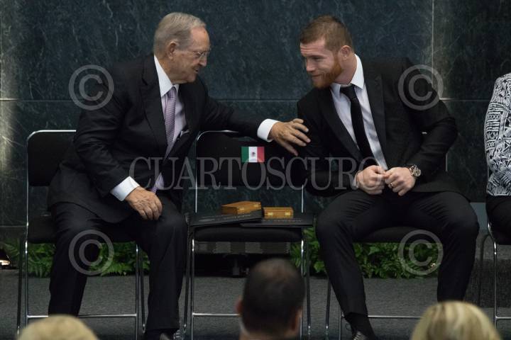 CIUDAD DE MÉXICO, 28MARZO2025.- El empresario mexicano y ex deportista Olímpico, Olegario Vázquez Raña, falleció esta mañana a la edad de 89 años. En la imagen, el empresario conversa con Saúl “Canelo” Álvarez durante la entrega del Premio Nacional del Deporte en noviembre 2018, evento en el que fue condecorado con el premio de trayectoria destacada en el deporte mexicano. FOTO: MOISÉS PABLO/CUARTOSCURO.COM