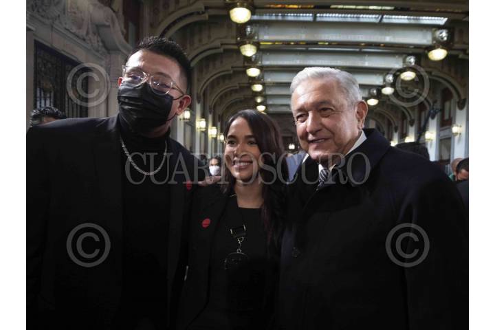 CIUDAD DE MÉXICO, 19DICIEMBRE2023.- Andrés Manuel López Obrador, presidente de México, y Beatriz Gutiérrez Müller, investigadora y primera dama, hicieron la entrega del Premio Nacional del Deporte 2023 a la árbitro de NBA Blanca Cecilia Casale durante la ceremonia de entrega del Premio Nacional del Deporte 2023 y Estímulo a las Delegaciones Mexicanas que participaron en los Juegos Panamericanos y Parapanamericanos 2023. FOTO: GALO CAÑAS/CUARTOSCURO.COM