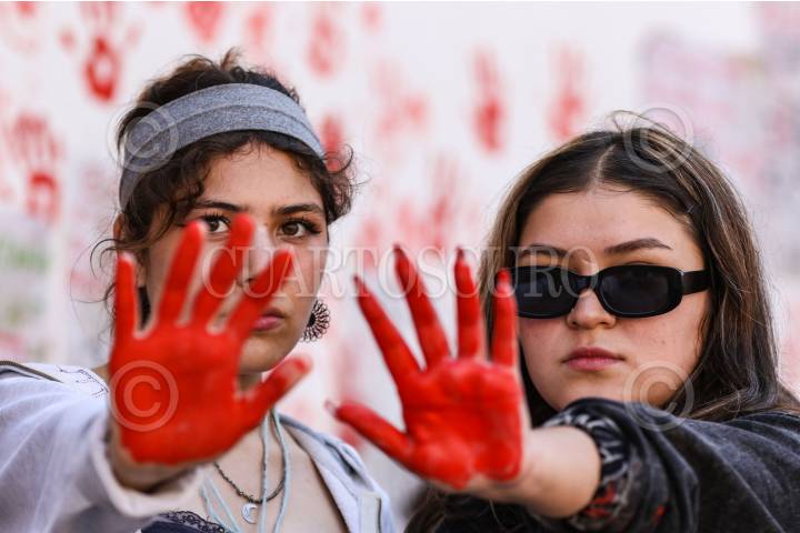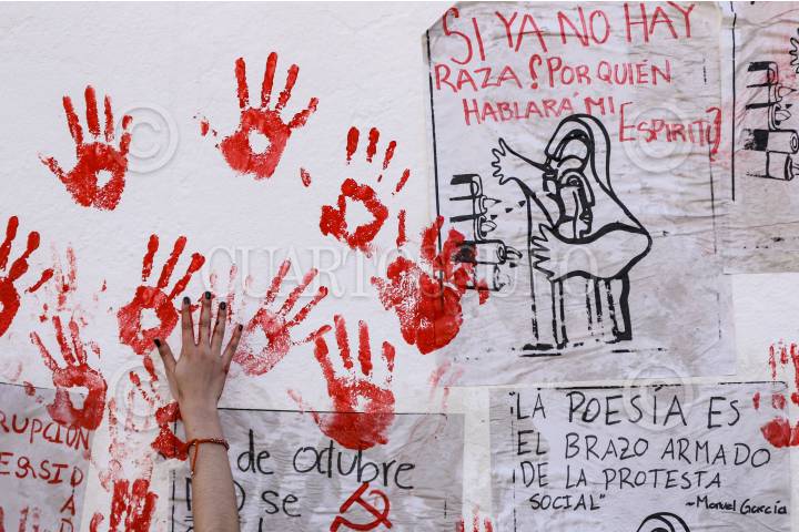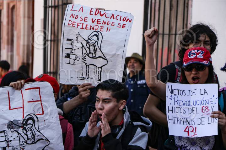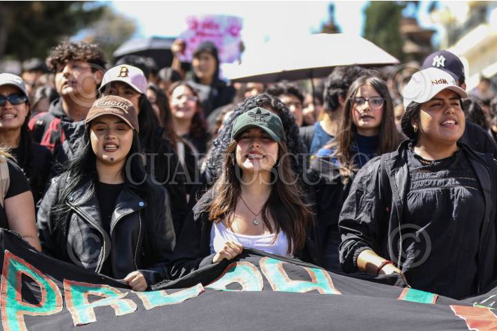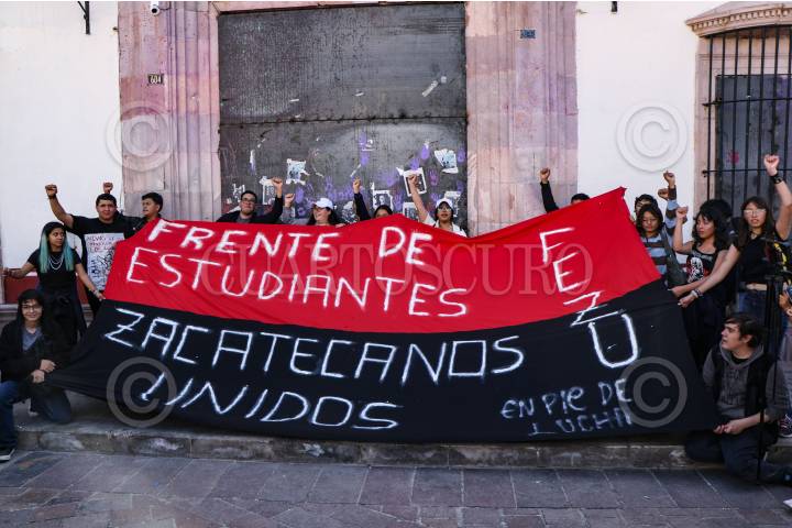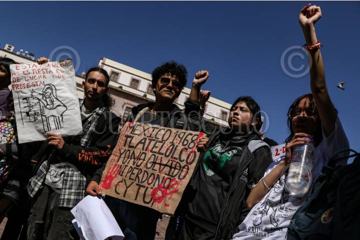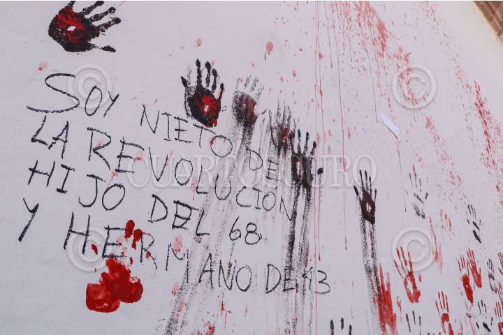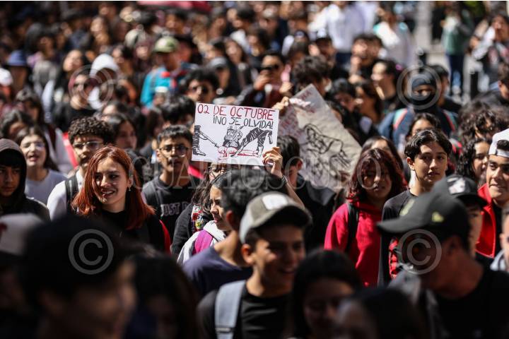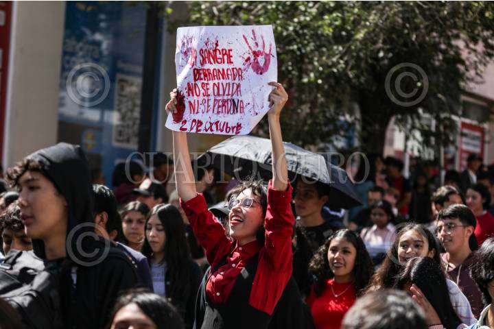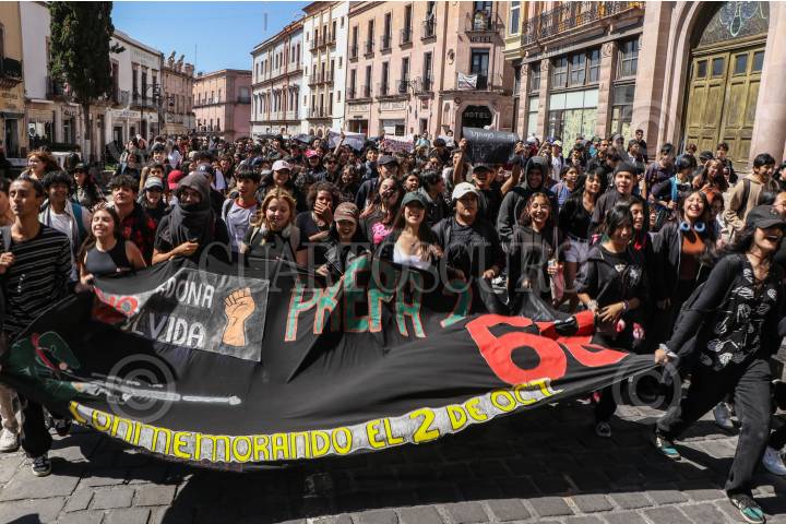 ZACATECAS, ZACATECAS, 02OCTUBRE2024.- Estudiantes de la Universidad Autónoma de Zacatecas, en su mayoría de Prepa 2, marcharon por las principales calles del centro histórico en memoria del 54 aniversario de la matanza de Tlatelolco, el 02 de octubre de 1968. La manifestación terminó en la Plaza de Armas, en donde los estudiantes pegaron carteles y plasmaron sus huellas en la fachada del edificio de Palacio de Gobierno. FOTO: ADOLFO VLADIMIR /CUARTOSCURO.COM