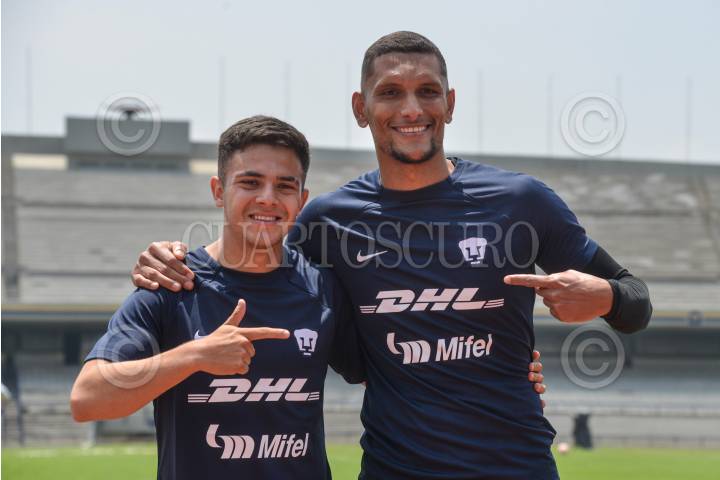 Marco Antonio García, e Higor Meritao, mediocampistas de los Pumas, posan para la fotografía al termino del entrenamiento en la cancha del Estadio Olímpico Universitario previo al arranque de la Liga MX Apertura 2022 en este fin de semana.