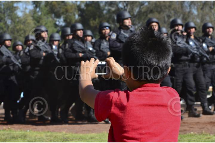 MÉXICO, DF., 18DICIEMBRE2013.- No perdía detalle; un niño retrata el desfile de elementos policíacos durante la Ceremonia de Ascensos en el Instituto Técnico de Formación Policial, en la que se otorgaron 4 mil 273 ascensos en total, lo que equivalió a 130 millones de pesos, de acuerdo con el informe de Jesús Rodríguez Almeida, secretario de Seguridad Pública. FOTO: MARÍA JOSÉ MARTÍNEZ /CUARTOSCURO.COM