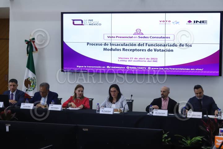 Ing. Jorge H. Torres; Ing. Jesús Ojeda; Carla A. Humphrey; Mtra. Claudia Zavala; Mtro. Arturo Castillo; Mtro. Roberto H. Cardiel y la Mstra. Verónica Sosa durante el proceso de Insaculación del Funcionariado de los Módulos Receptores de Votación en sedes consulares de Estados Unidos y Canadá en instalaciones del Instituto Nacional Electoral.