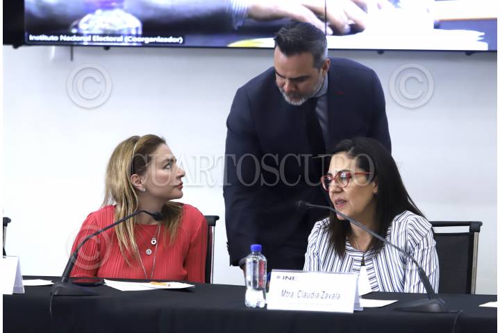 Carla A. Humphrey; Mtra. Claudia Zavala y el Mtro. Roberto H. Cardiel durante el proceso de Insaculación del Funcionariado de los Módulos Receptores de Votación en sedes consulares de Estados Unidos y Canadá en instalaciones del Instituto Nacional Electoral.