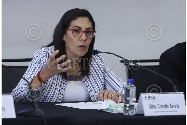 Mtra. Claudia Zavala durante el proceso de Insaculación del Funcionariado de los Módulos Receptores de Votación en sedes consulares de Estados Unidos y Canadá en instalaciones del Instituto Nacional Electoral.