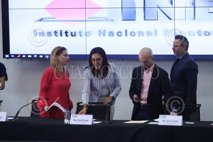 Carla A. Humphrey; Mtra. Claudia Zavala; Mtro. Arturo Castillo; Mtro. Roberto H. Cardiel y la Mstra. Verónica Sosa durante el proceso de Insaculación del Funcionariado de los Módulos Receptores de Votación en sedes consulares de Estados Unidos y Canadá en instalaciones del Instituto Nacional Electoral.