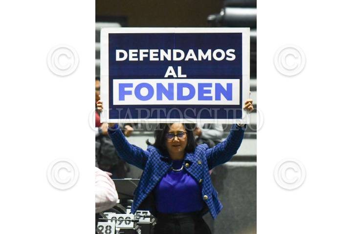 CIUDAD DE MÉXICO, 13FEBRERO2024.- Karla Verónica González, diputada del PAN, muestra una cartulina en defensa del Fonden, durante la sesión ordinaria de la Cámara de Diputados. FOTO: MARIO JASSO/CUARTOSCURO.COM