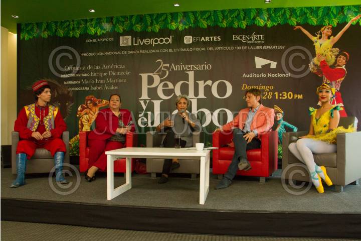 CIUDAD DE MÉXICO, 11MARZO2019.- Rodrigo Fuentes (Pedro); Isabel Ávalos, directora artística; Arcelia de la Peña, Directora ejecutiva; Mario Iván Martínez, narrador y Cecilia Sanchez (Pajarito), anunciaron en conferencia de prensa desde el salón verde del Auditorio Nacional que el domingo 28 de marzo se celebrará la función de 25 aniversario del Ballet, Pedro y el lobo, la cual contará con la orquesta de las Américas tocando en vivo. FOTO: ROGELIO MORALES /CUARTOSCURO.COM