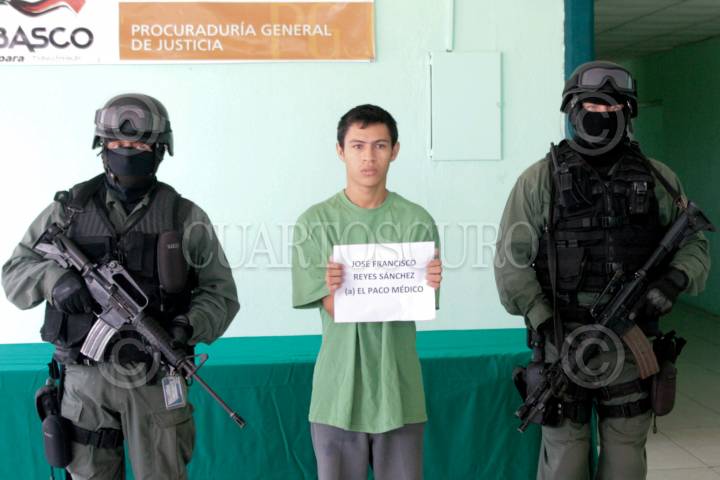 VILLAHERMOSA, TABASCO, 22OCTUBRE2010.- Jose Francisco Reyes Sanchez, alias "El Paco Medico" fue presentado en las instalaciones de la Policía Ministerial tras haber sido detenido en la cabecera municipal de Huimanguillo, donde tenia privada de su libertad a una menor de edad. El detenido reconoció ser el responsable y autor de ocho secuestro y de haber privado de la vida a tres personas mas entre ellas a dos de sus cómplices. Finalmente dijo haber sido halcón del brazo armado Zeta y cometió los delitos con la participación de adolescentes estudiantes en los municipios de Comalcalco, Cunduacan, Cardenas y Huimanguillo. FOTO: MARCO POLO GUZMAN HERNANDEZ/CUARTOSCURO.COM