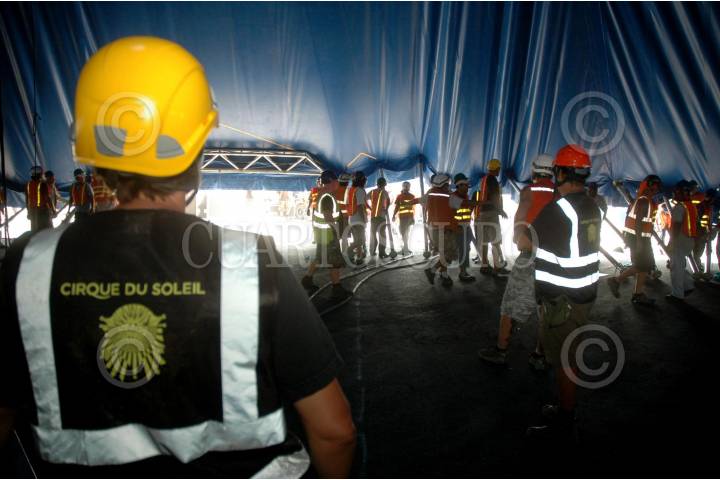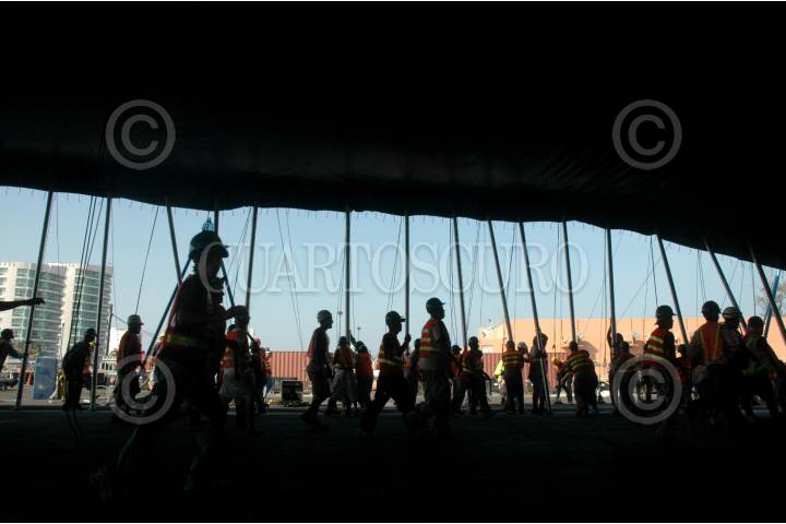 VERACRUZ, VERACRUZ. 15FEBRERO2008.- Por primera vez llega con sus setecientas cincuenta toneladas de equipo el espectáculo del Cirque Du Soleil, a Veracruz, presentando QUIDAM con diez fechas a partir del veintisiete de Febrero. El día de hoy quedo instalada la gran carpa donde trabajaron mas de cien hombres para su colocación. FOTO: JOSÉ CANDELARIO/CUARTOSCURO.COM