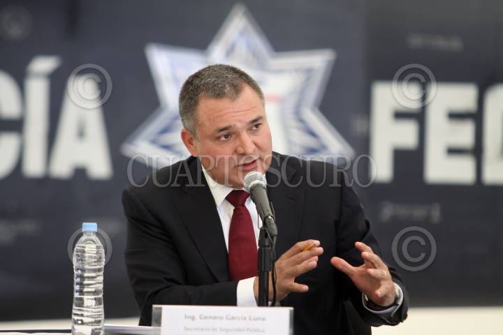 MÉXICO, D.F., 31JULIO2010.- Genaro Garcia Luna, secretario de Seguridad Pública Federal durante una conferencia de prensa en el Centro de Alto Mando de la Policía Federal en Iztapalapa en donde estuvieron presentes los reporteros Javier Canales Fernandez de Multimedios Torreón y Alejandro Hernández Pacheco de Televisa Torreón quienes fueron rescatados por elementos de la Policía Federal en un operativo en la colonia Miguel de la Madrid en Gómez Palacio, Durango. FOTO: RODOLFO ANGULO/CUARTOSCURO.COM