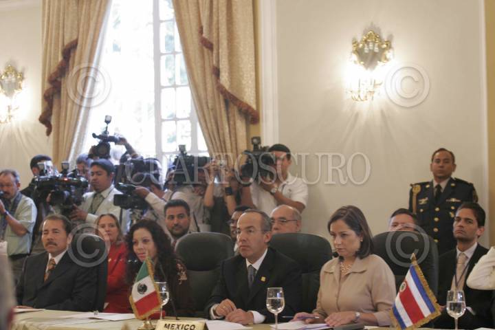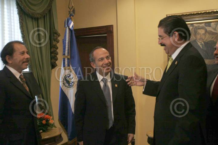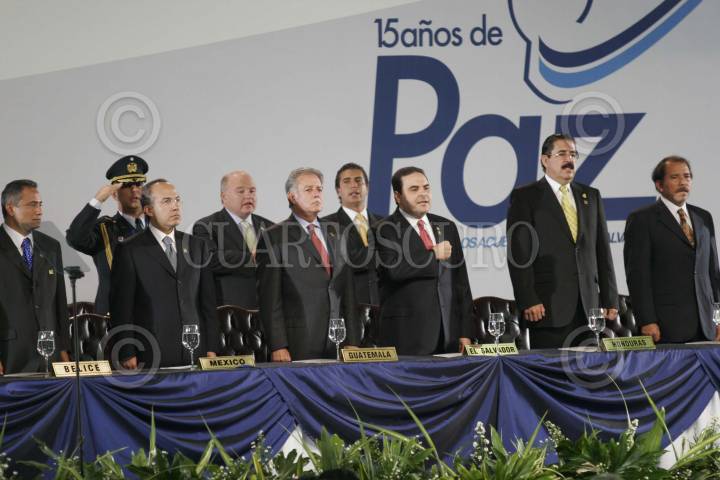 SAN SALVADOR, REPUBLICA DEL SALVADOR 16ENERO2007.- El presidente Felipe Calderon Hinojosa durante el acto conmemorativo del XV aniversario de la firma de los acuerdos de paz de El Salvador lo acompañan sus homologos, Oscar Berguer, Elias Antonio Saca, Manuel Zelaya, y Daniel Ortega. FOTO:ALFREDO GUERRERO/CUARTOSCURO.COM