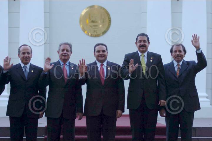 SAN SALVADOR, REPUBLICA DEL SALVADOR 16ENERO2007.- El presidente Felipe Calderon en el marco de la celebración del XV Aniversario de la firma de los acuerdos de paz, junto a los Jefes de Estado y de Gobierno se tomaron la foto oficial, por Guatemala Oscar Berguer, El salvador Elias Saca, Honduras Manuel Zelaya, Nicaragua Daniel Ortega. FOTO:IMERIO RESENDIZ/CUARTOSCURO.COM