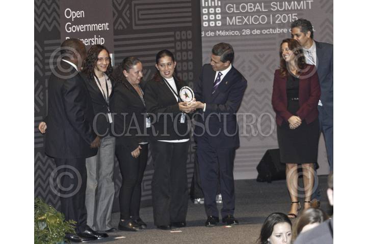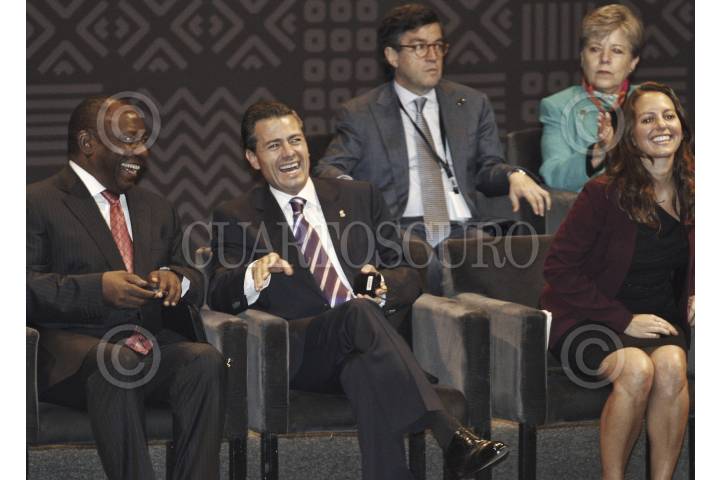 MÉXICO, D.F., 28OCTUBRE2015.- Cyril Ramaphosa, vicepresidente de Sudáfrica, Enrique Peña Nieto, presidente de México, y Suneeta Kaimal, presidenta de la Alianza por el Gobierno Abierto, durante la Inauguración de la Cumbre Global de Gobierno Abierto 2015, en el Palacio de Bellas Artes. FOTO: ISAAC ESQUIVEL /CUARTOSCURO.COM