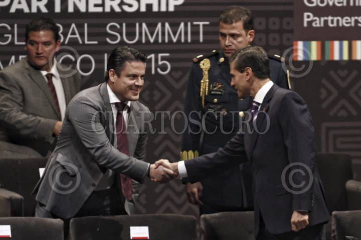 MÉXICO, D.F., 28OCTUBRE2015.- Aristóteles Sándoval, gobernador de Jalisco saluda a Enrique Peña Nieto, presidente d México, durante la inauguración de la Cumbre Global de Gobierno Abierto 2015, en el Palacio de Bellas Artes. FOTO: ISAAC ESQUIVEL /CUARTOSCURO.COM