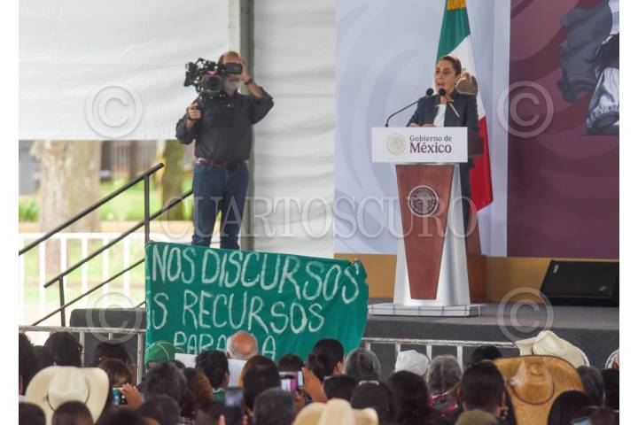 TOLUCA, ESTADO DE MÉXICO, 14SEPTIEMBRE2025.- Durante el evento La Transformación Avanza encabezado por Claudia Sheinbaum, Presidenta de México, que se realizó en el Parque Metropolitano Bicentenario, integrantes del Enjambre Estudiantil Unificado de la UAEMÉX desplegaron mantas en protesta. FOTO: CRISANTA ESPINOSA AGUILAR/CUARTOSCURO.COM